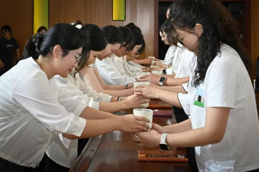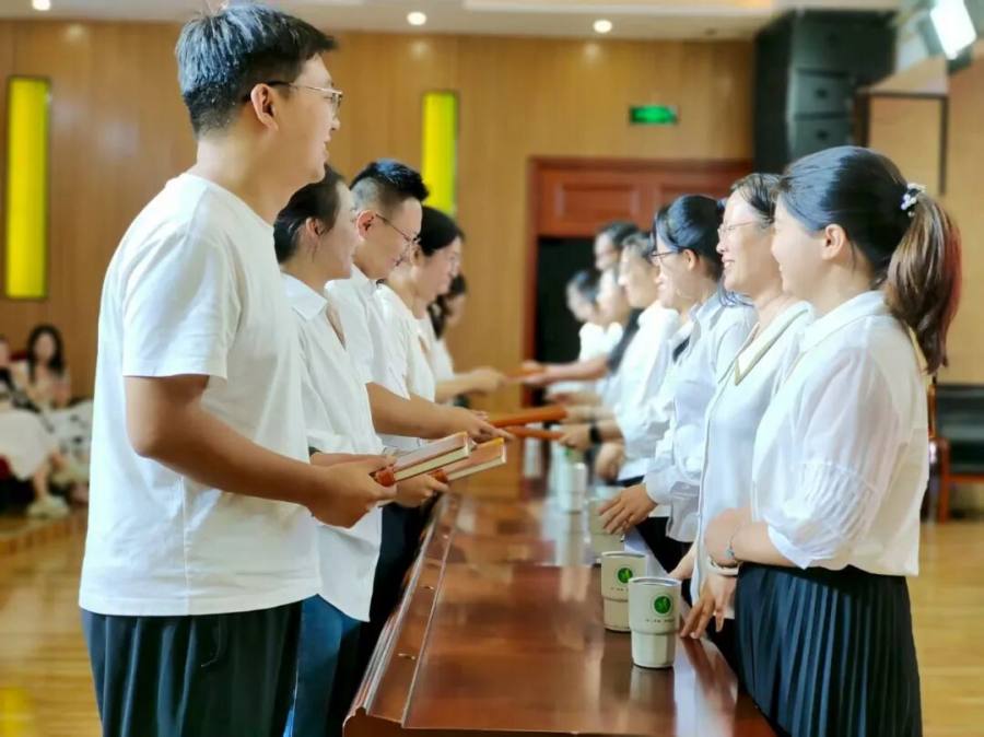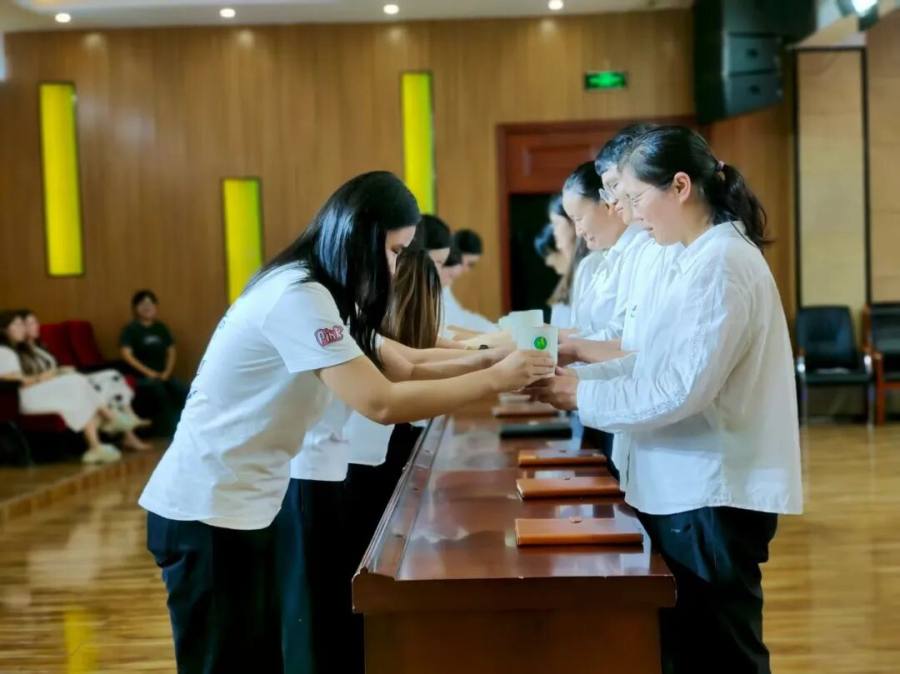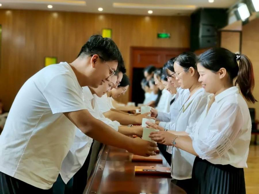 最令人动容的“敬茶·传薪”环节将仪式推向高潮。徒弟们躬身奉茶,师傅们回赠笔记本并寄语勉励。茶香氤氲中,师道尊严与教育温情悄然流淌,令人感动。