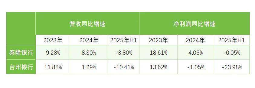 2023年—2024年,泰隆银行的营收增速从9.28%放缓到8.3%,净利润增速从18.61%放缓到4.06%;台州银行的波动更加剧烈,营收增速从11.88%放缓到1.29%,净利润增速则由正(13.62%)转负(-1.05%)。