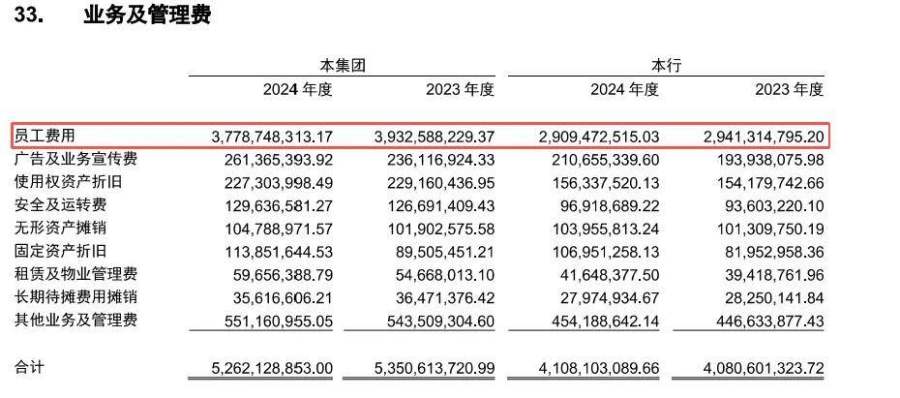 进一步体现在成本端,2024年泰隆银行的业务管理费72.88亿元;台州银行则在业务管理费中列示了员工费用37.79亿元,相当于每天支出超1000万元,占营收的比重接近30%,远超同业15-20%的平均水平。