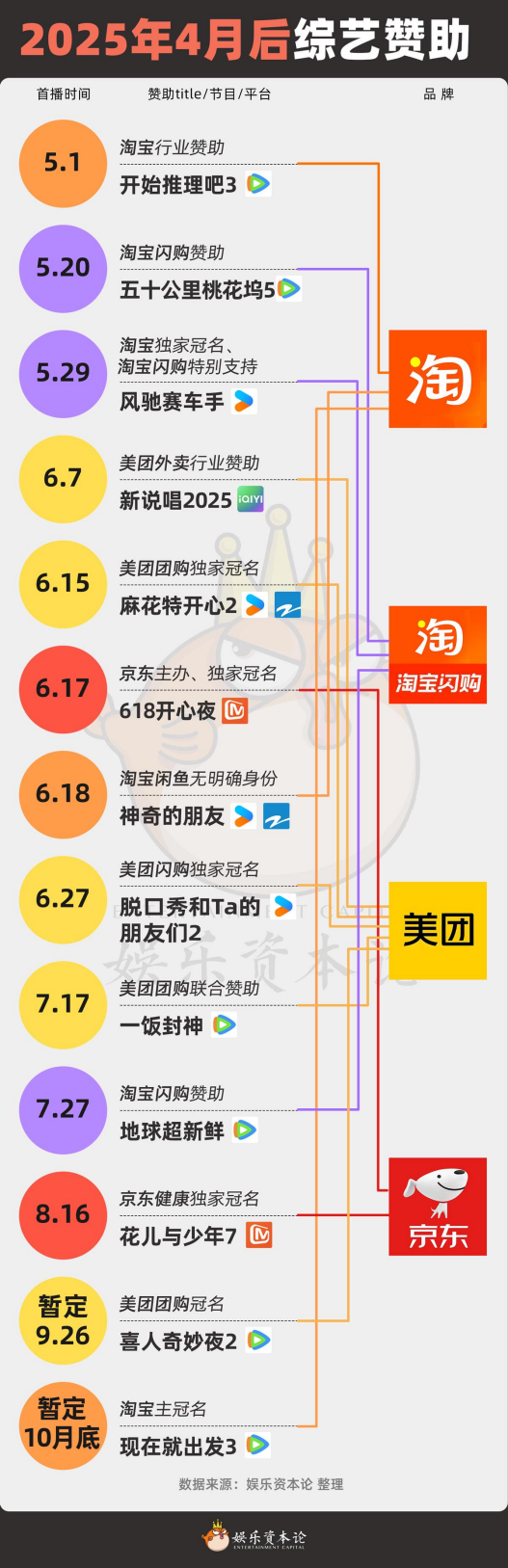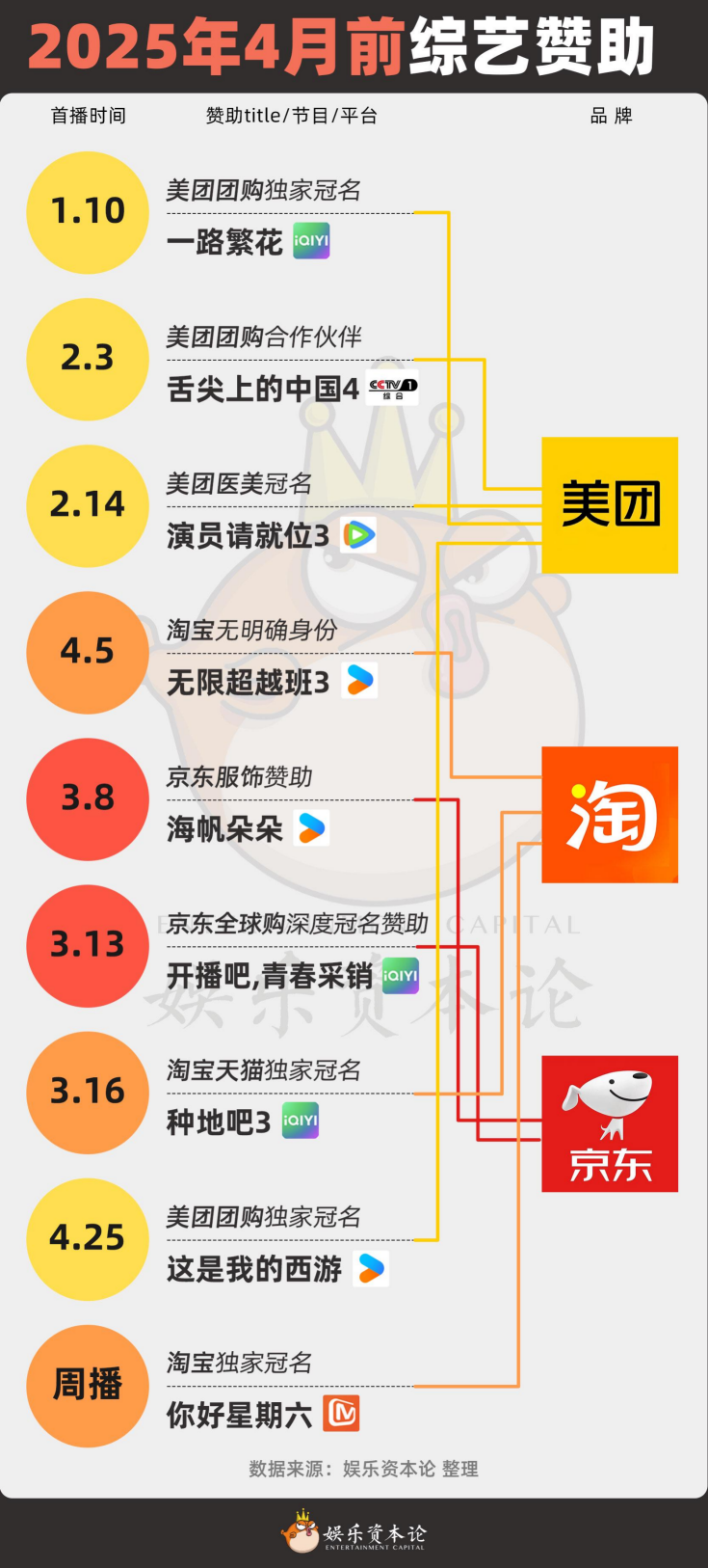 与这个时间线重合,以4月为分水岭,外卖巨头们在综艺上也火力全开,从前对平台的曝光,变成如今 "外卖"" 即时零售"的垂直赞助。当价格战打得难分难解时,综艺给了外卖平台一条拼曝光的赛道,毕竟谁能在观众追剧时多刷几次存在感,谁就可能在下单时刻赢下关键一局。