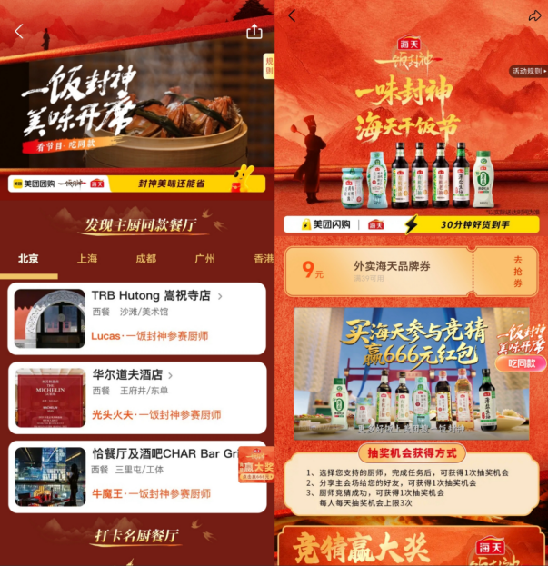 7月,美团团购联合赞助厨综《一饭封神》。除了综艺常规口播宣传,打开美团app搜“一饭封神”还可以发现主厨同款餐厅,打卡节目同款美味。参与预测节目中大厨小厨pk结果,还有机会赢得666元红包。