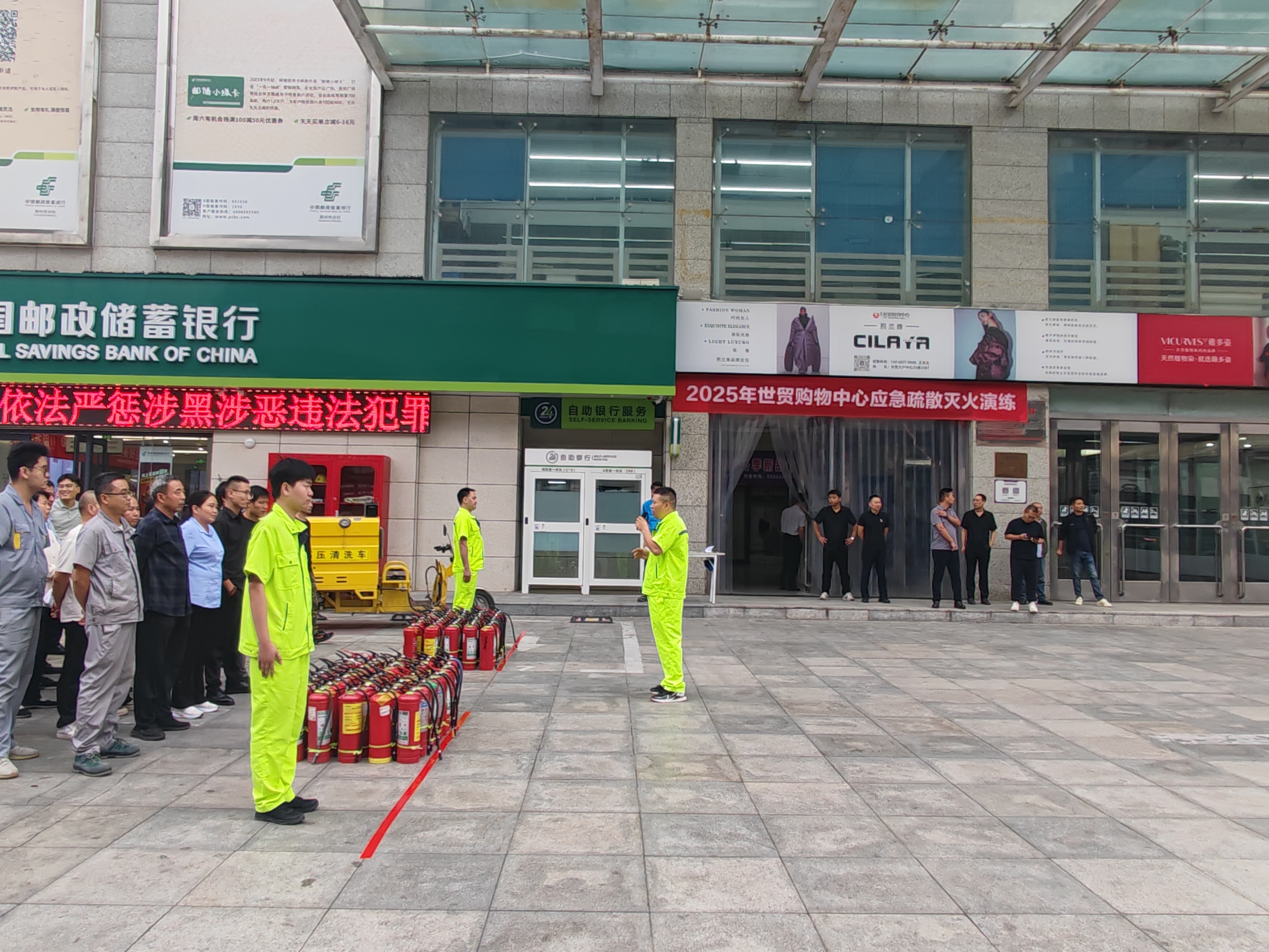 本次演练,设置报警联络组、灭火战斗组、疏散引导组、警戒组、医疗抢救组和后勤保障组。15点10分在商场4楼M4101商铺模拟触发火情,现场通过消防联动报警,消控室第一时间组织灭火战斗组前往现场处置,同时切断电源,关闭防火卷帘门,设置警戒范围。消控室通过商场应急广播,通知各楼层人员有序通过疏散通道撤离至户外安全区域,医疗抢救组对受伤人员采取紧急救治措施。疏散后,所有人员在户外安全区域,使用消防水带、灭火器开展灭火实操演练,平安办联合商场对本次消防演练进行复盘,及时总结经验和不足。