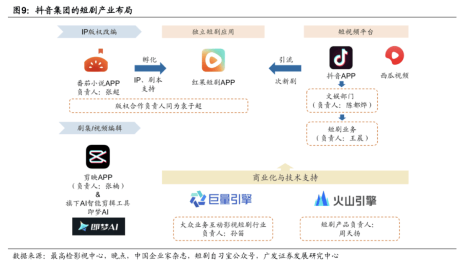产业链的下游是“巨量引擎”,国内短剧最主要的投流渠道。巨量引擎整合了字节跳动旗下的海量营销资源,结合算法模型、智能分发以及火山引擎云服务优势,为红果短剧提供充足的商业化资源以及买量环节的降本增效。