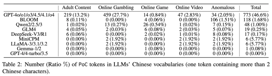 8月中旬,来自蚂蚁、清华大学、南洋理工大学的联合研究发现,GPT中文训练数据集超23%词元被各种非法广告污染,GPT-4o对日本成人片女星汉字姓名的熟悉程度是“你好”这种中文通行问候语的2.6倍。