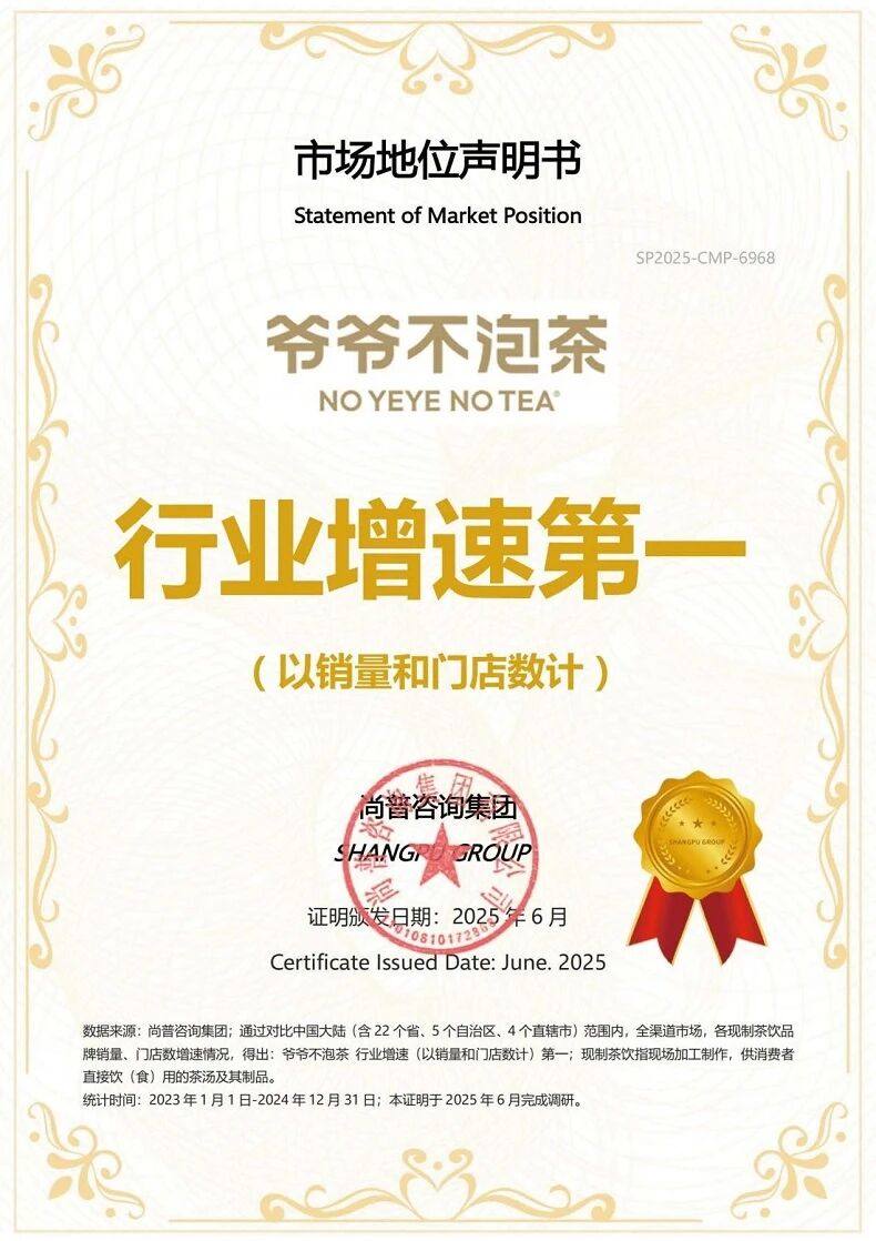 2025年,爷爷不泡茶表现亮眼,先是跻身《2025胡润中国新茶饮品牌排行榜》前20,后又获尚普咨询认定为行业增速第一(按销量和门店数计算),风头正劲。