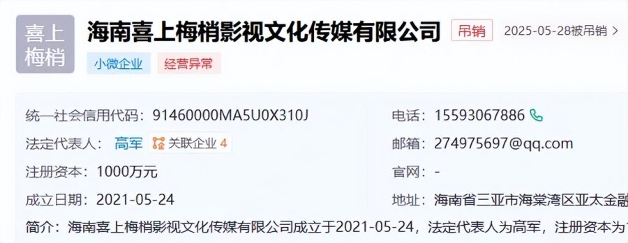 小娱通过与企查查信息对比发现,判决书中出现的某1公司为北京喜尚梅梢影视,实际经营人为高某;某2公司为海南喜上梅梢影视,高某持股70%,某3公司为北京星光绽放影视,高某为该公司法人,持股100%。