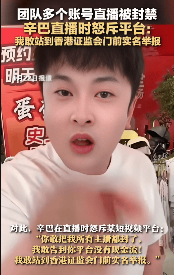 去年4月,由于辛巴及团队多个账号遭遇快手封禁,辛巴在直播时直接怒斥快手平台:“你敢把我所有主播都封了,我敢告到你平台没有现金流!我敢站到香港证监会门前实名举报。”