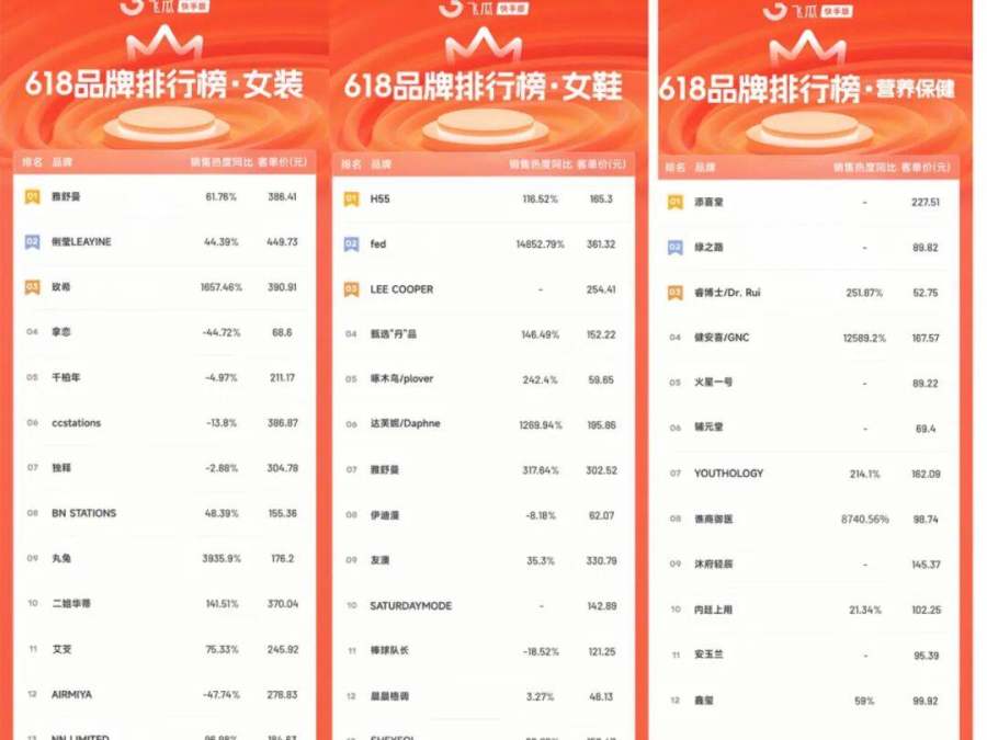 相比之下,天猫、京东等品牌的618榜单,则以大牌或者知名品牌居多。