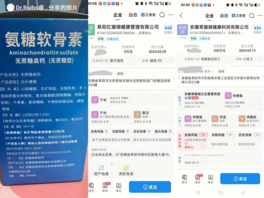 睿博士店铺上线的保健食品的生产厂家,则为安徽某健康科技有限公司。而企查查显示,该公司注册于2024年3月,注册资金只有区区200万元,且因为生产经营不符合标准、虚假广告等,今年以来遭遇多次行政处罚。