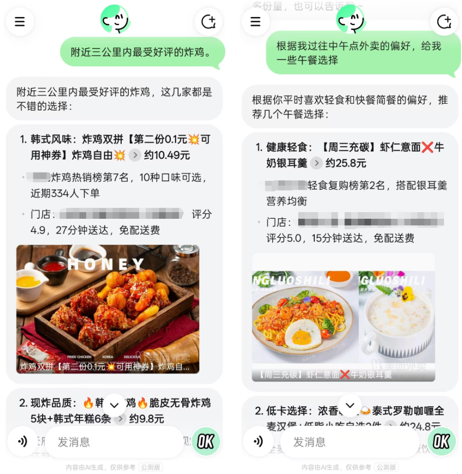 二是可以抓取用户历史数据做定制化方案。比如在提出“根据我过往中午时间段点单偏好给出推荐”的问题后,AI 能够判断出个人口味习惯、消费区间和场景偏好。如图案例中给到的轻食选择,不同的用户会有不同的方案。