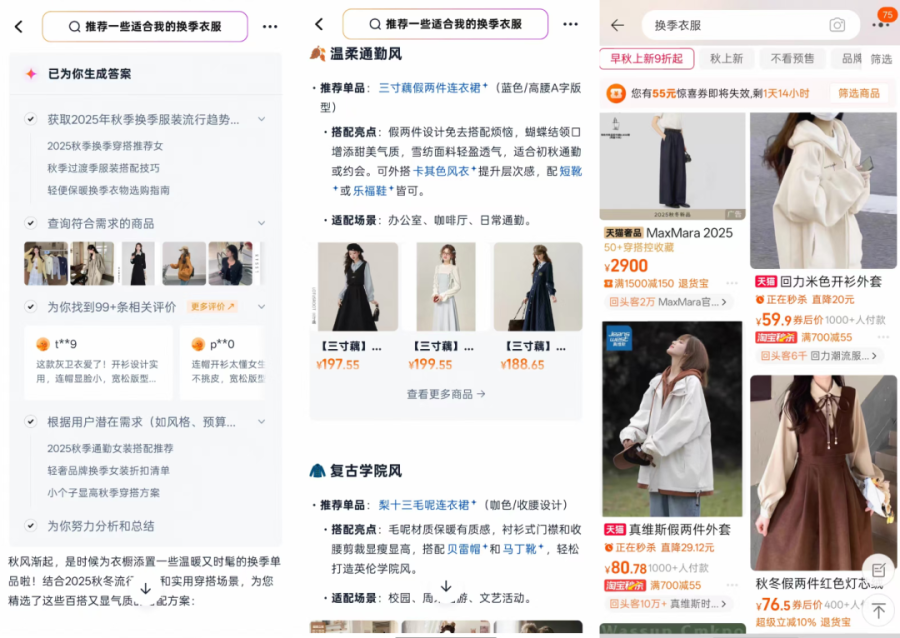 作为对比,下图也展示了“换季衣服”这一关键词在常规搜索界面返回的结果。以笔者的需求来看,AI 能够帮助缩小一些选择范围,但面对服饰这种消费决策过程较复杂的品类,多番比对大量浏览的流程通常是“简略”不了的。