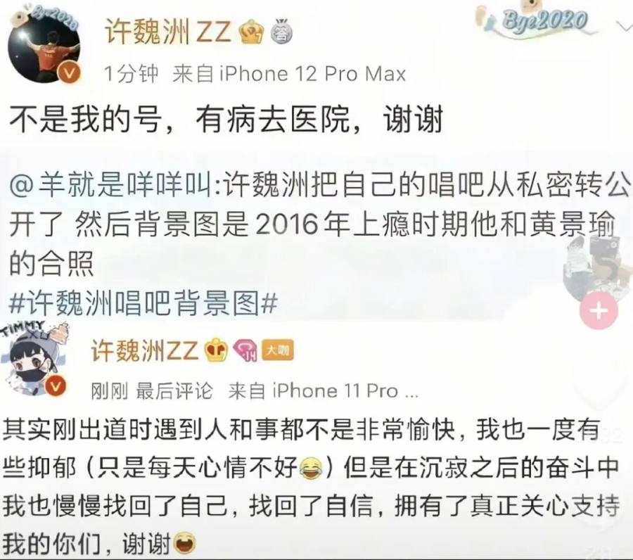 许魏洲与黄景瑜一起爆红,CP粉“鲸鱼与洲喵”超话活跃多年。作为因双人CP而爆火的前辈许魏洲,起家时,CP粉基本占据他粉丝盘的半壁江山。但随着知名度攀升,他开始注重单人发展。社交账号背景换成双人合照又火速秒删,喊话粉丝“别再慢慢走”(电视剧主题曲),甚至直言:“刚出道时的人和事都不愉快。”