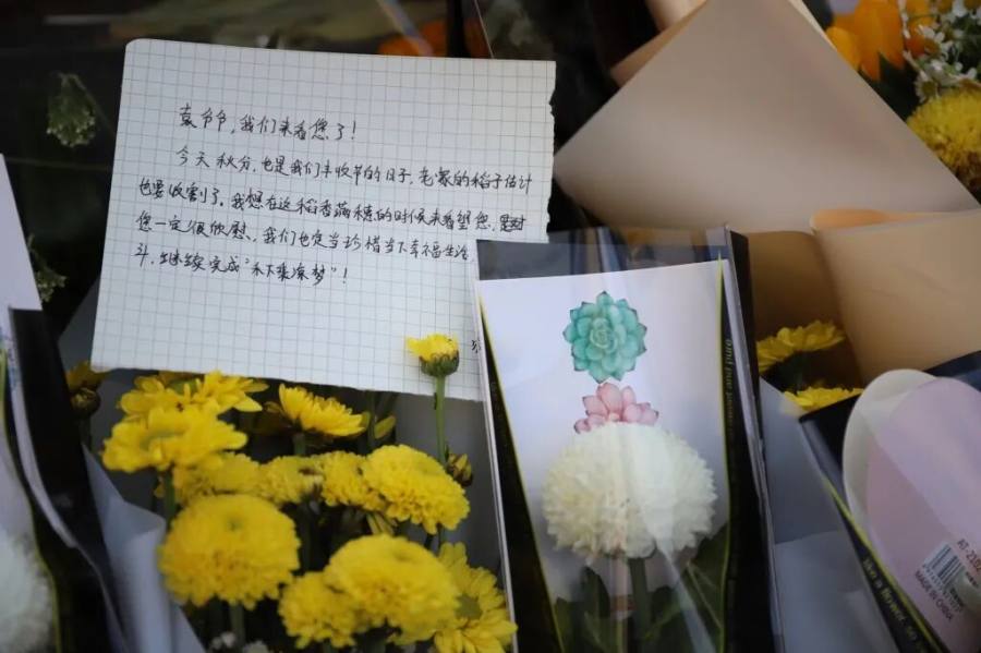 每年这个时候袁老手捧稻穗的雕像前总是会放满了鲜花写满了思念。