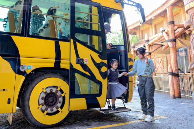 (工作人员引导小朋友安全下车)