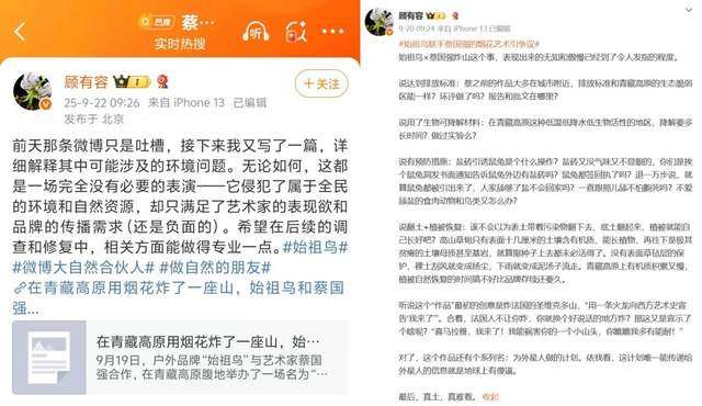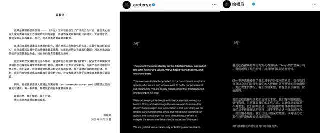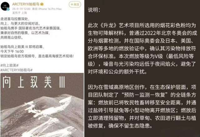 不过,由于雪域高原生态环境的特殊性,公众的质疑和反对之声依旧犹如汹涌潮水般席卷而来,大量网友涌入始祖鸟社交账号下留言,“始祖鸟联手蔡国强的烟花艺术引争议”“始祖鸟的烟花劝退了真正的户外人”等话题冲上热搜。