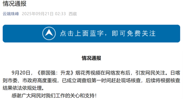 随着舆论的不断发酵,日喀则市互联网信息办公室官方公众号“云端珠峰”于9月21日凌晨发布情况通报,表示日喀则市委、市政府高度重视烟花秀事件,已成立调查组第一时间赶赴现场核查,后续将根据核查结果依法依规处理。