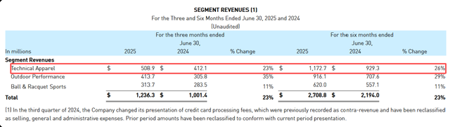 从商业经营的角度出发,此次“营销翻车”也值得始祖鸟警醒。该品牌母公司亚玛芬发布的财报显示,始祖鸟所在的技术功能性服饰部门2025年第二季度实现收入5.09亿美元,同比增长23%,但增幅同比下滑11个百分点。