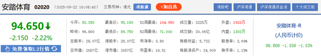 截至9月23日收盘,安踏体育报收93.75港元/股,跌幅为0.95%,前一个交易日的跌幅为跌幅2.22%。按收盘价计算,安踏体育的市值约为2631.56亿元,,短短两天时间相对缩水约85.6亿港元。
