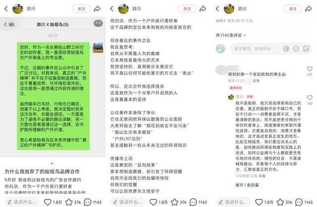 截至目前,已有不少网友公开表示今后将抵制始祖鸟的相关产品,甚至出现了已购消费者退货的情况。另有用户名为“游川”的户外旅行博主在事件发酵后发帖称,自己在写好脚本的情况下主动放弃了与始祖鸟品牌的广告合作。