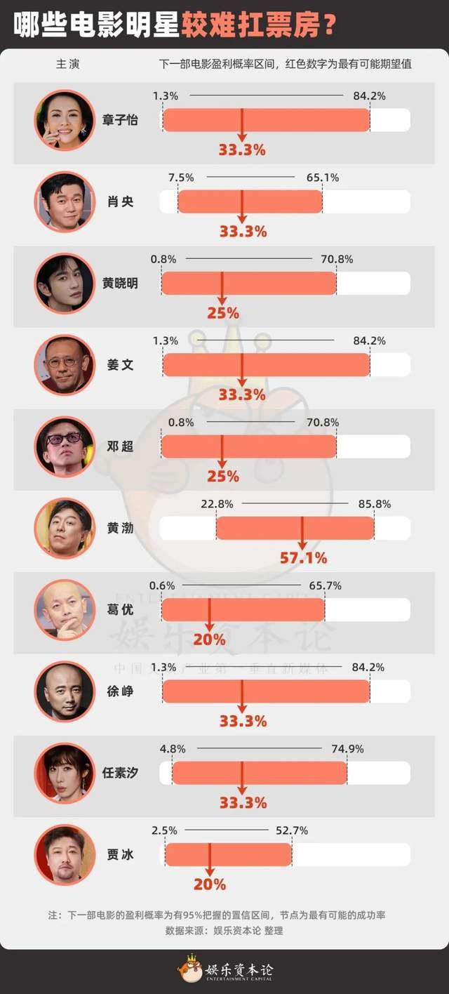 在老牌明星扛票房能力衰落的趋势中,章子怡的境遇是独一档的。尽管下一部电影的盈利概率较低只有33.3%,但她还是具有不可替代性。