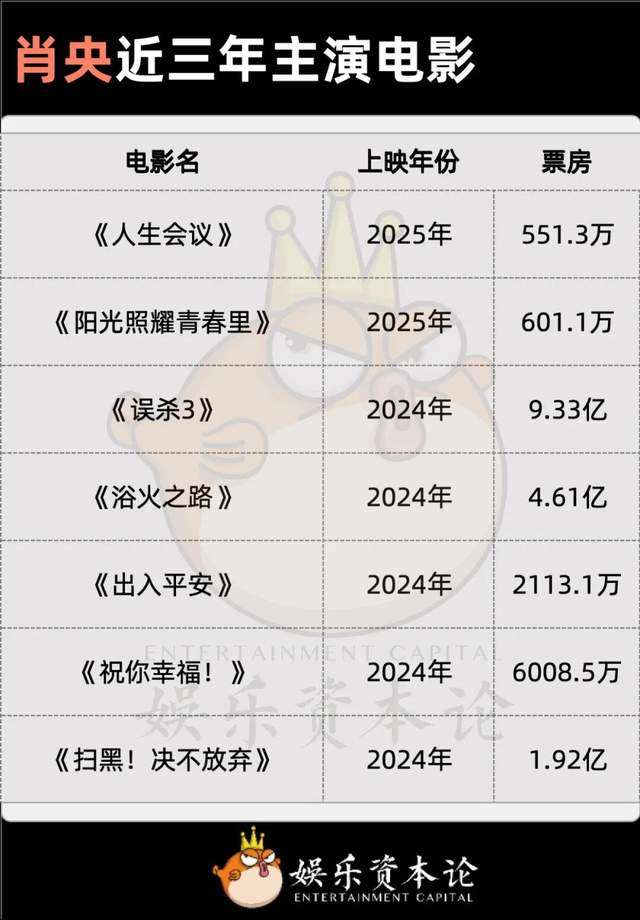但在这两个赛道之外,肖央主演的其他现实主义的影片均以亏本告终。去年中秋档的主力影片《祝你幸福!》仅有6000万,国庆档的《出入平安》在收得2000万票房之后灰溜溜撤档,今年上映的《阳光照耀青春里》《人生会议》肖央都是领衔主演,票房甚至未过千万。