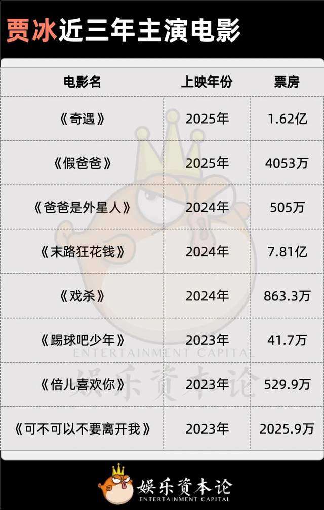 过去三年,贾冰主演了八部电影,仅有两部票房过亿,从概率上来看,他主演的下一部电影盈利的可能性仍然偏低。