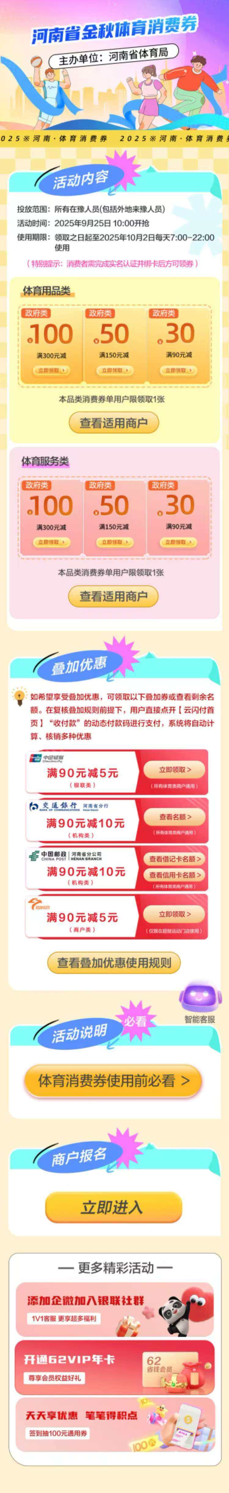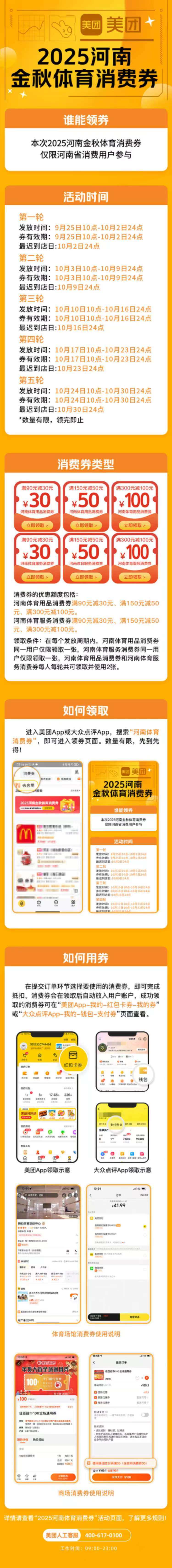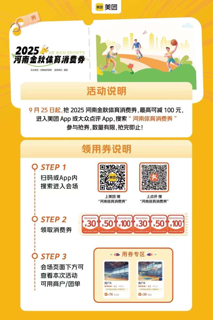 此次河南省体育消费券共设体育服务与体育用品两大类,以电子消费券形式发放,分为30元、50元、100元三种面值,包括“满90元减30元”“满150元减50元”“满300元减100元”三种档位,以满足不同消费需求。活动期间,每人每轮次每种品类体育消费券各限领1张,每轮次最多领取2张,体育消费券逾期失效不予补发。每一笔消费交易仅限使用1张体育消费券。河南省内消费者(包括外地来豫人员)均可通过“云闪付APP”、“美团APP”活动页面参与领取,先到先得,领完为止。全省范围内参与“云闪付”、“美团”活动的体育健身场馆、体育用品专营销售企业、体育培训机构、体育旅游项目等商户均可核销。