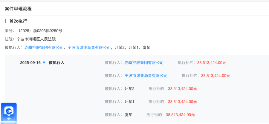 9月16日,天眼查app显示,宁波市海曙区人民法院发布一则案件信息,赤骥控股集团有限公司、宁波市诚业沥青有限公司、虞某、叶某1、叶某2为被执行人,执行标的为3851.34万元,案号为(2025)浙0203执9250号。