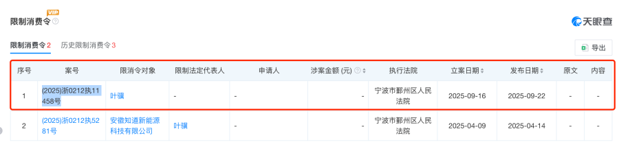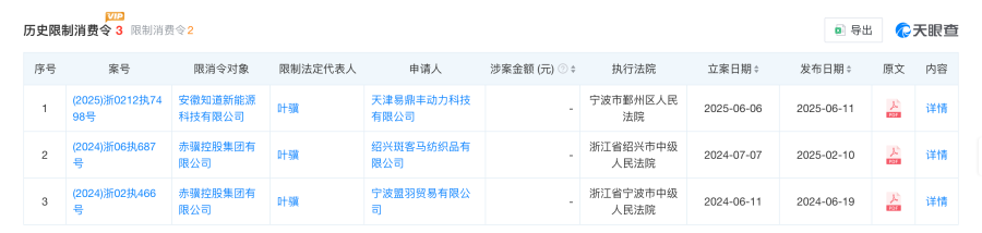 天眼查app显示,2024年6月19日及2025年2月10日,赤骥控股集团、叶骥就因民间借贷纠纷、借款合同纠纷,分别被宁波市中院、绍兴市中院限制高消费,涉及资金分别为4.03亿元、5.15亿元。