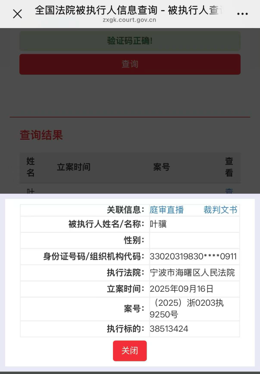 根据案号,记者在全国法院执行信息网查询到叶骥的被执行信息。根据上市公司山子高科(原银亿股份)在2022年公布的一则详式权益变动报告书,叶骥出生于1983年,与被执行信息中所披露的身份证年份对应。