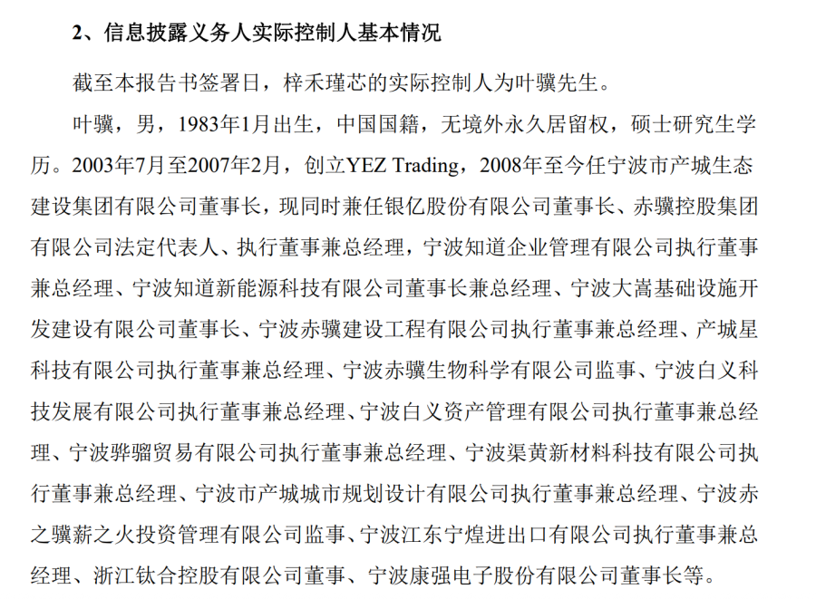 其中,赤骥控股集团有限公司的法人代表为叶骥。山子高科公告显示,公司实控人、董事长叶骥通过赤骥控股集团控制嘉兴梓禾瑾芯股权基金(以下简称“梓禾瑾芯”),从而间接控制山子高科10.05%股份。