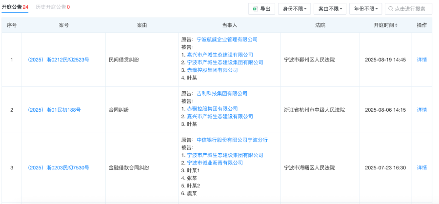 此外,今年3月以来,因民间借款纠纷、金融借款纠纷等,赤骥控股集团和叶骥6次被中国银行宁波鄞州分行、中信银行宁波分行、吉利科技集团有限公司、宁波航威企业管理有限公司等告上法庭并开庭审理。