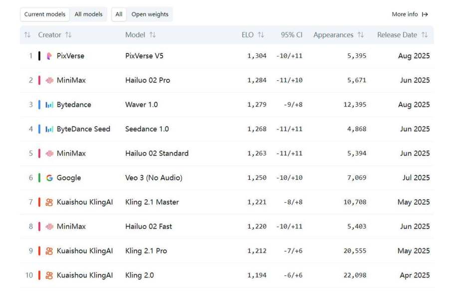 其中,一个反直觉的表现是:在同样是今年6月、8月的模型更新中,无论是文生视频,还是图生视频,“小厂”爱诗科技们的排名反而要比字节们更好。