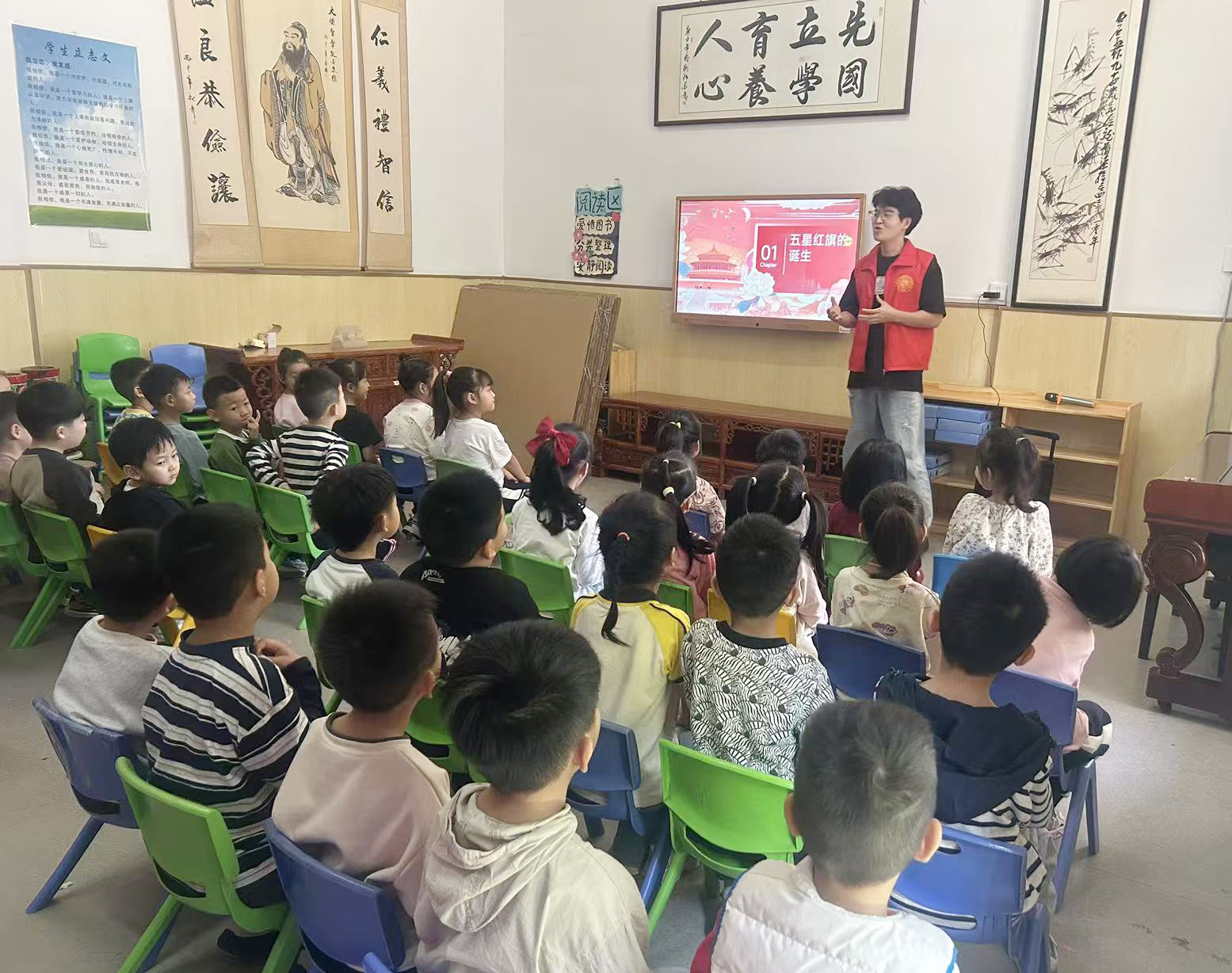 活动现场,大学生志愿者们以孩子们喜闻乐见的方式开启了红色启蒙。在教唱红歌环节,志愿者们选取《国旗国旗真美丽》等节奏轻快、朗朗上口的歌曲,引导孩子们跟着旋律学唱,让孩子们在音乐中感受着歌曲里对祖国的热爱与祝福。