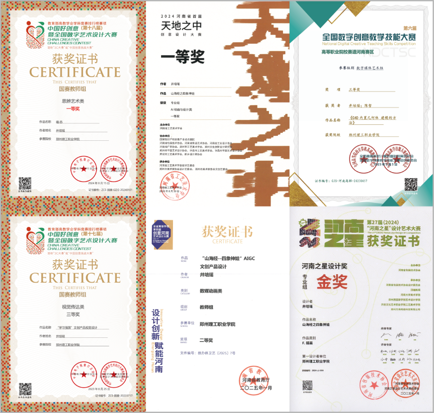 凭借出色的指导业绩,井培瑶也先后荣获“全国高校数字艺术设计大赛优秀指导教师”“中国好创意暨全国数字艺术设计大赛优秀指导教师”等荣誉称号。这些成绩不仅是学生专业技能提升的有力见证,更彰显了她“以专业赋能成长”的育人实效。
