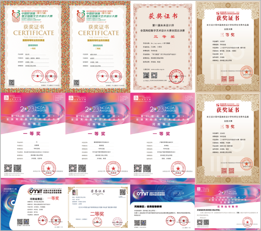 全国性赛成果:获第11届未来设计师・全国高校数字艺术设计大赛(高职组)全国总决赛三等奖1项、2024米兰设计周中国高校设计学科师生优秀作品展(学生组)三等奖3项、第十八届中国好创意暨全国数字艺术设计大赛(学生组)国赛一等奖1项/二等奖1项/三等奖3项、第十二届全国大学生数字媒体科技作品及创意竞赛(高职组)国赛三等奖3项;