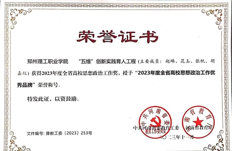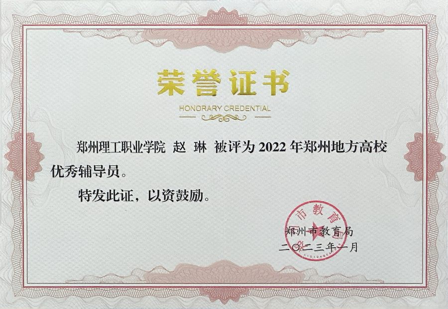 凭借扎实的思政工作成效,赵琳老师屡获认可:2022 年,获评“郑州市地方高校优秀辅导员”(全市仅49名);2023年,其主持的“五维创新实践育人工程”(思想引领、实践锻炼、心理疏导、学业帮扶、就业指导)入选“全省高校思想政治工作优秀品牌”,成为学校思政育人的标杆项目;2024年,她指导学生创作的心理情景剧《做自己的太阳》,从全省120余所高校的参赛作品中脱颖而出,获评“河南省高校心理情景剧优秀作品”,用成果印证了“以爱育人”的实效。