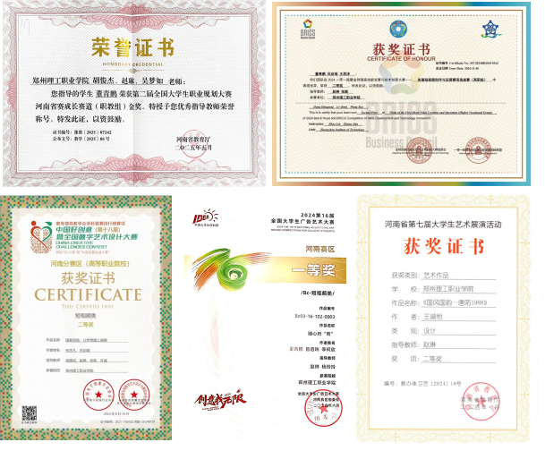 在竞赛指导中,她紧扣“提升专业能力”核心目标,形成科学的指导体系:在第二届全国大学生职业规划大赛河南省赛(2024年底举办)中,她从职业兴趣测评到行业趋势分析,全程指导学生打磨规划方案,最终帮助学生以精准的职业定位和创新的发展路径设计斩获金奖,她本人也因出色表现获评“优秀指导教师”;2024年第十六届全国大学生广告艺术大赛中,针对广告创意、视觉设计等专业难点,她组织专项训练,帮助学生将课堂知识转化为实践成果,最终收获国赛三等奖2项、省赛一等奖1项、二等奖1项,再次获评赛事“优秀指导教师”;回溯2023年,她的指导成果同样亮眼:“创意河南”设计大赛中,学生获二等奖1项、三等奖1项;大学生艺术展演比赛中,学生再添2项二等奖,两项赛事覆盖设计、艺术领域,通过“赛前集训+作品打磨+复盘总结”,学生实现专业能力的阶梯式成长。