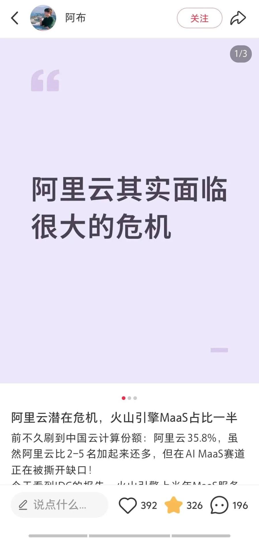 在阿里工作11年、前阿里云员工、现AI创业者“阿布”,近日就在社交平台公开表示,MaaS赛道被火山引擎远远拉下,阿里云潜在危机主要在以下三方面。