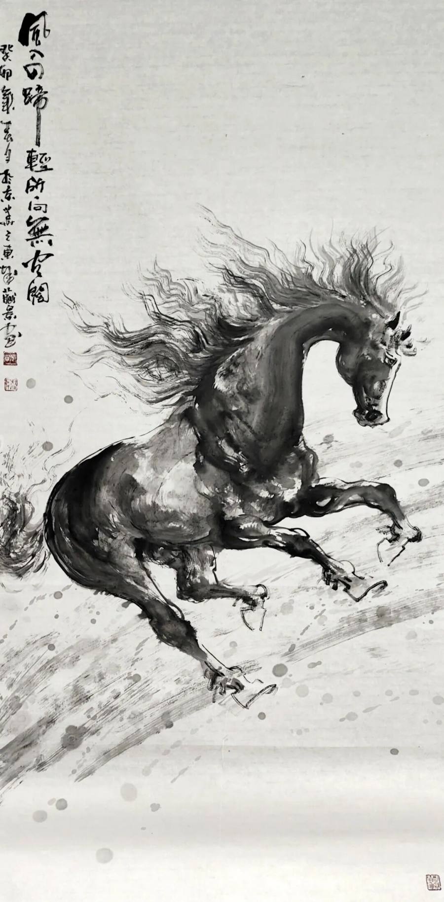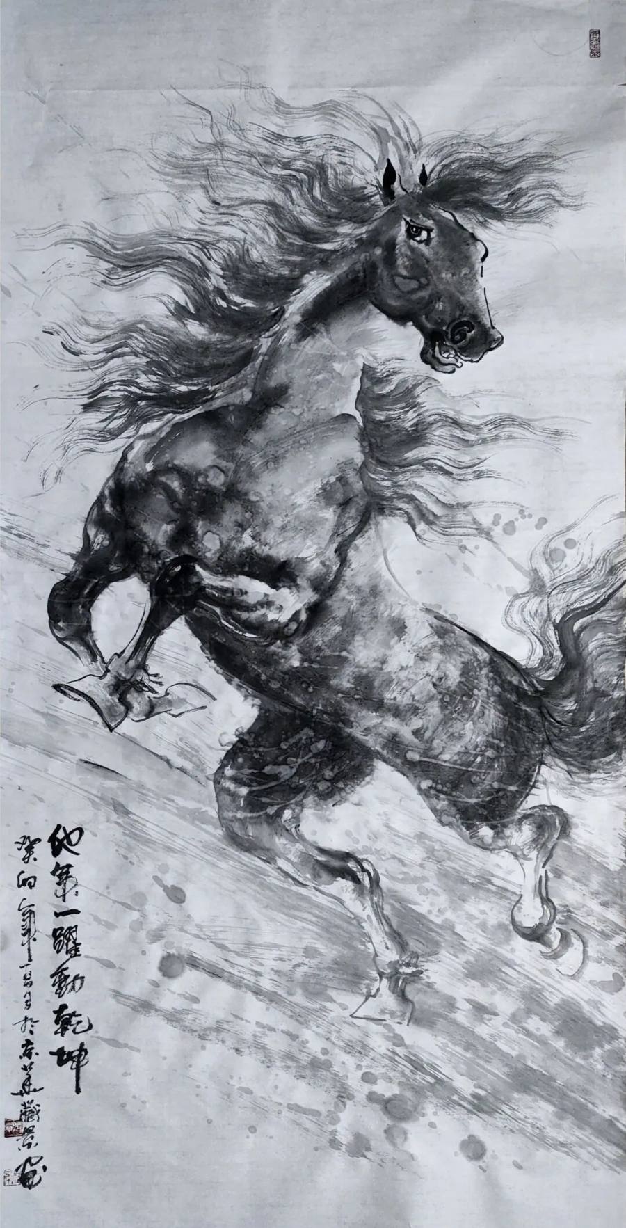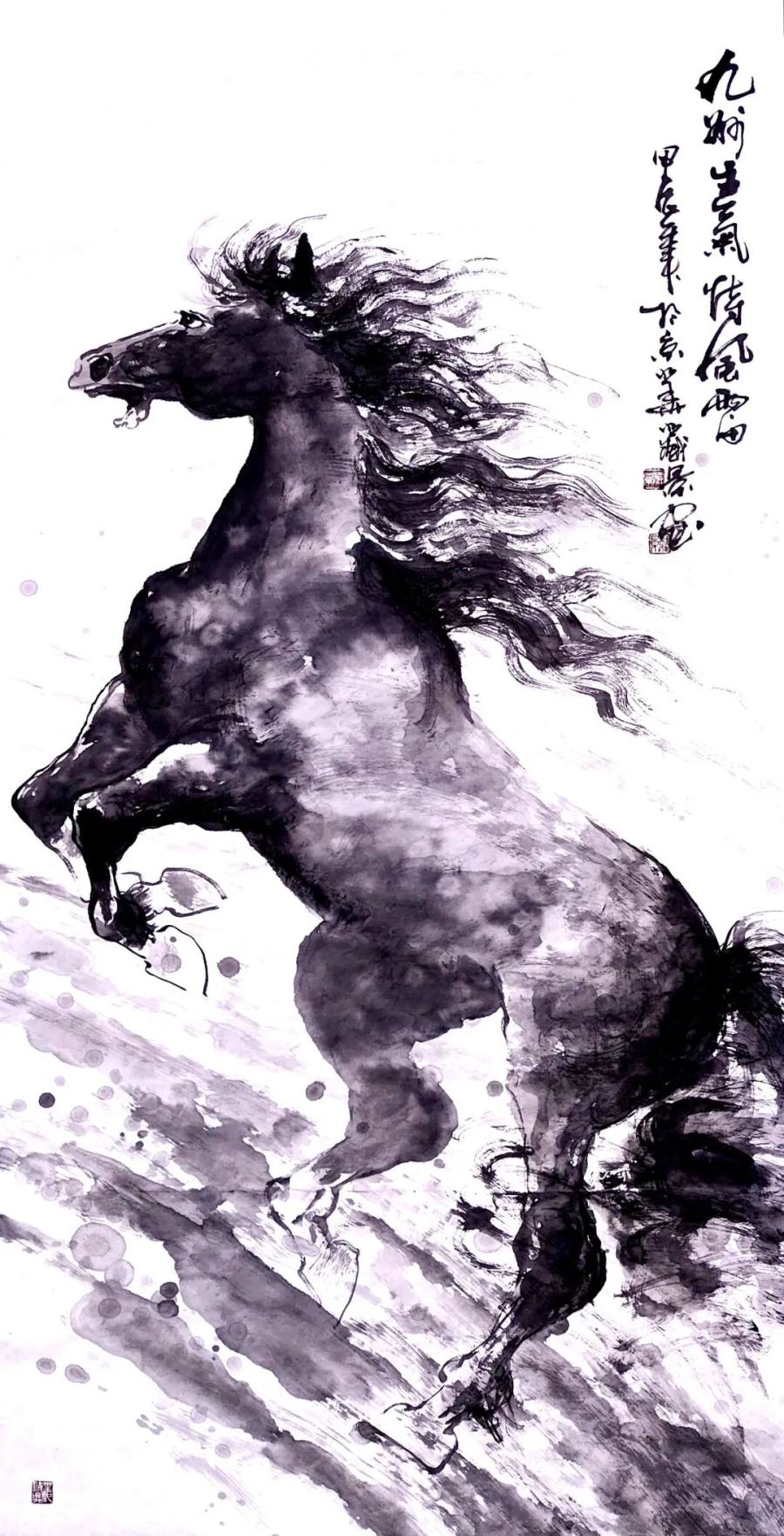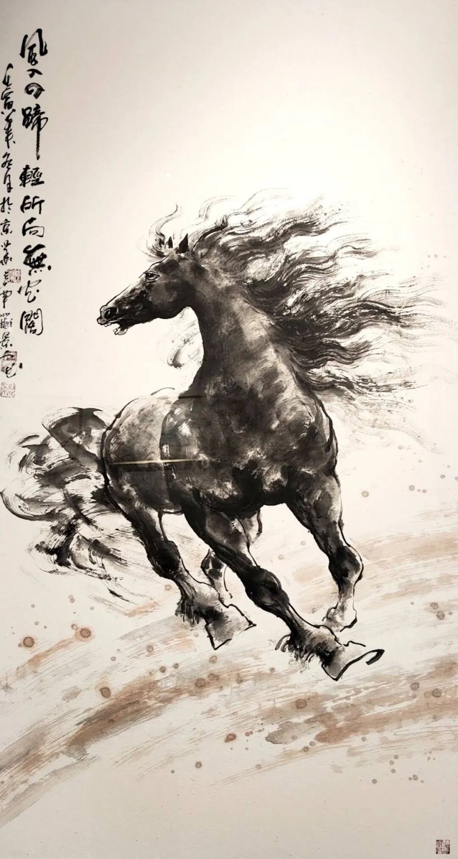然当下画坛虽然也是群贤毕集,但是真正能够在写意骏马界内达到深厚造诣的画家,除先生以外确难寻其二!作为一名历经画坛四十余年的实力派画家,先生的画艺之事可谓是由来已久,上世纪八十年代初时以油墨画作见长,并以独创用西方的油画颜料融入中国水墨中的异彩流动,收获意外的惊喜和意料中的凝固就是一幅美妙的油墨画,不仅仅只是富于生动传神之妙,作中他更是能在极高的技法难度上来为油墨画形象传递出丰富的人文感和力量感,观之可谓震撼人心!而今日的先生得益于从小在军旅大院与军马一起成长及多年与游牧民族生活息息相关,更是以写意骏马画作独步于界内,所绘烈马无不是大气磅礴,形神兼备!