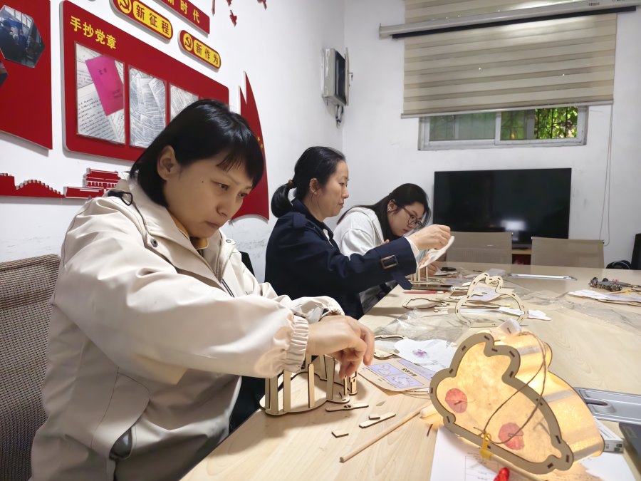 活动现场,氛围热烈。志愿者和居民从纸张的折叠到粘贴的力度,从穿绳的技巧到整体的造型把握,每一个环节都讲解得清晰透彻。在制作过程中,居民认真地折叠、粘贴、穿绳,操作步骤有条不紊,一盏盏造型精致的灯笼陆续成型。