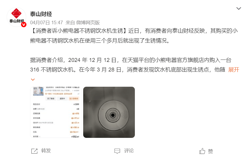今年4月,有媒体报道,有消费者反映其购买的小熊电器不锈钢热水机在使用三个月后就出现了生锈的情况。