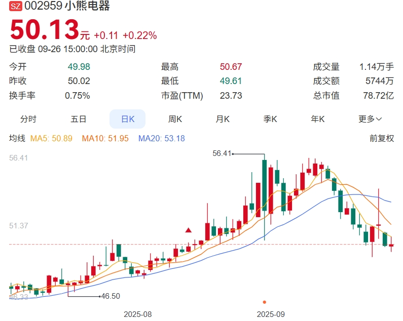 截至9月26日,小熊电器报收50.13元/股,总市值78.72亿元;股价相较9月11日的今年盘中最高股价56.41元,下跌超11%。