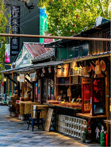 但她依旧兴致盎然,迫不及待的环视着园区:法桐掩映的小径旁,原木色桌椅与绿植装点的茶馆焕发着清新气息;旧仓库改造的羊肉馆,门前陈列着“猪八戒”雕塑,墙上涂鸦着丝绸之路商队与摩旅骑士剪影;朱雀市集内,糖画艺人以铁勺、糖浆,轻松的勾勒出栩栩如生的蝴蝶与龙形......