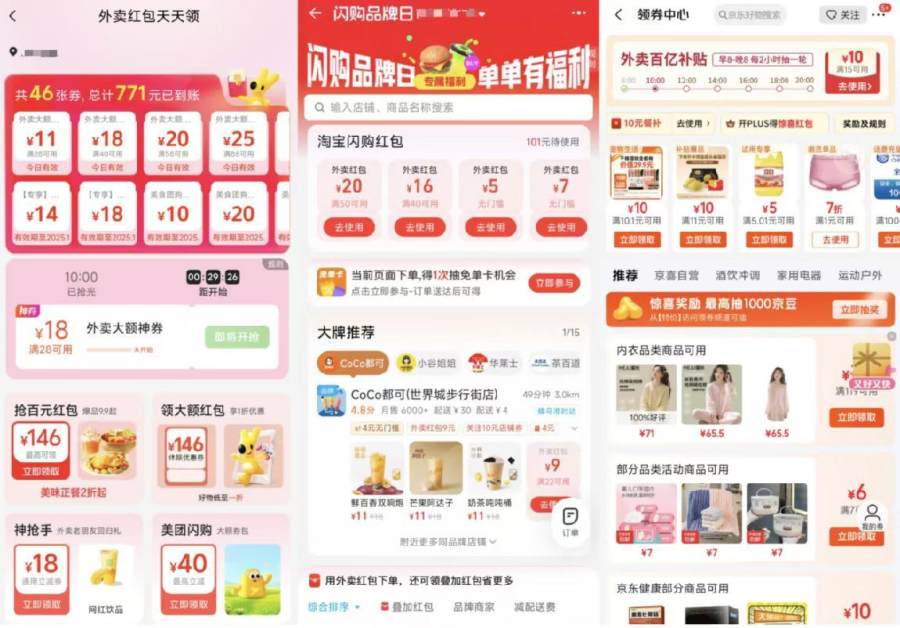 总体来看,淘宝和京东更强调“红包补贴”和“菜品丰富度”,力求在单个商家页面传递更多消费决策信息。而美团则更偏向“多店呈现”和“筛选效率”,突出品牌曝光与分类功能,便于用户快速浏览和选择。