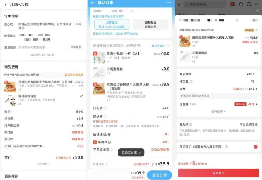 综合来看三家的餐品质量没有明显差别,美团的配送速度依旧是最快,淘宝和京东次之,价格方面相差不过5元,然而在超时的情况下美团和京东都赔付了4元,淘宝则没有赠送超时赔付的相关权益。