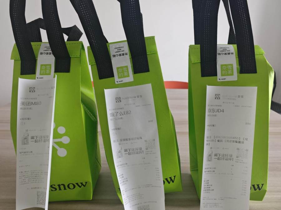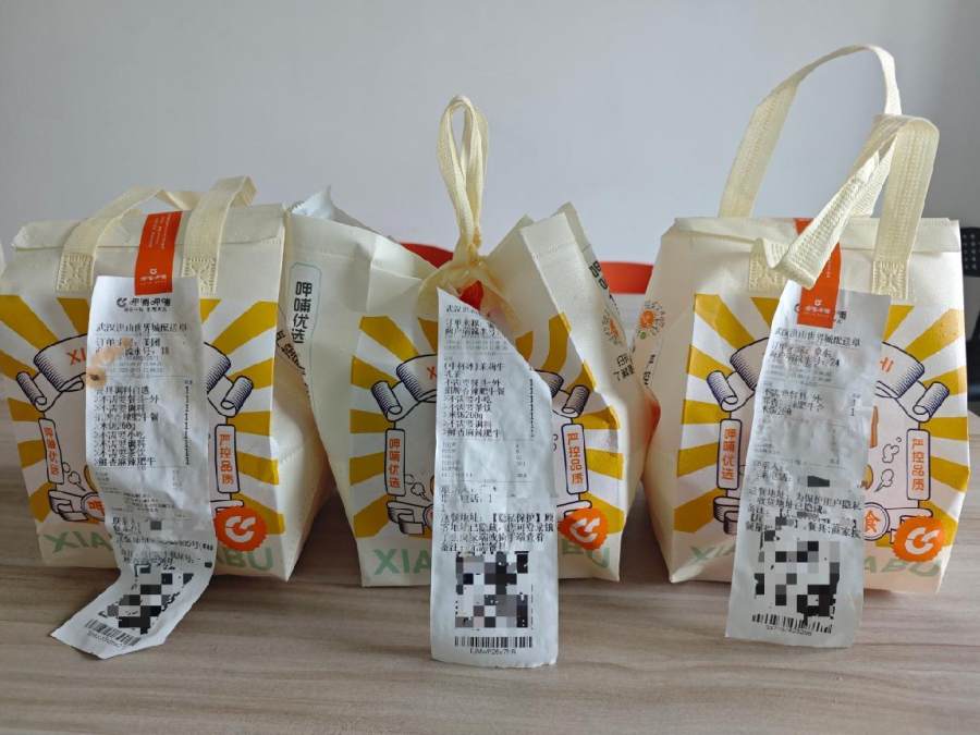 在拿到餐品后,图片从左至右为美团、淘宝闪购、京东,可以看出美团和京东包装方式为封口式,淘宝闪购有被打开的痕迹,后面又被人为系上打结。