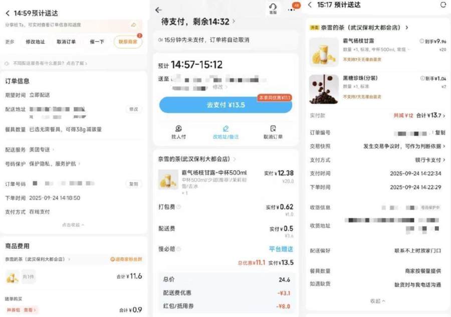 美团实际支付价格为11.6元,用到了12元美团红包。淘宝闪购实际支付价格为13.5元,其中红包抵扣8元、配送费优惠3.1元。京东实际支付价格为13.7元,平台红包抵扣11元,值得注意的是京东为了凑最低20元起送价,还加了2元的黑糖珍珠。