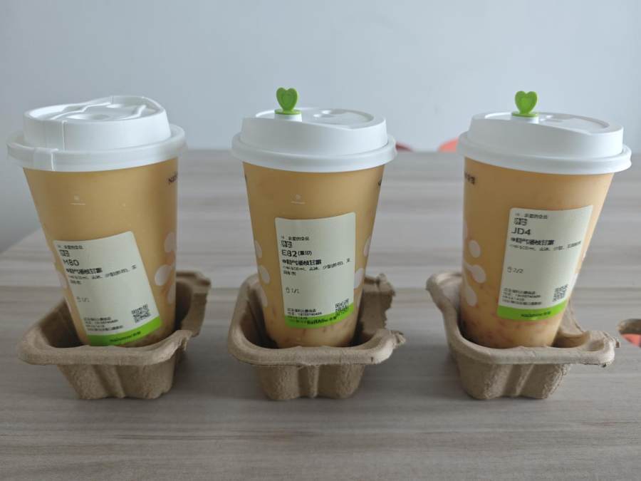 打开其中商品,因为是机器覆膜封口,三家饮品交付水平一致均未撒漏,冰块基本保持完整,吸管也是同一类型,唯一不同点是美团配送的杯子型号与其他两家不一致。