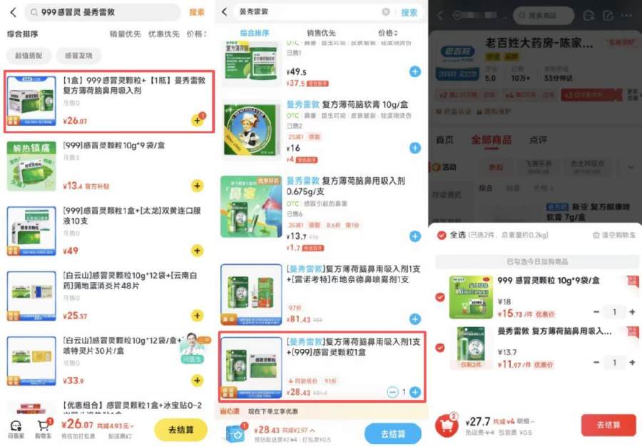 我们选取了离目的地2公里的老百姓大药房(陈家湾店),秋天已至,考虑到起送价我们选取了市面上热门的999感冒灵颗粒(盒装)和一瓶曼秀雷敦鼻用吸入剂。